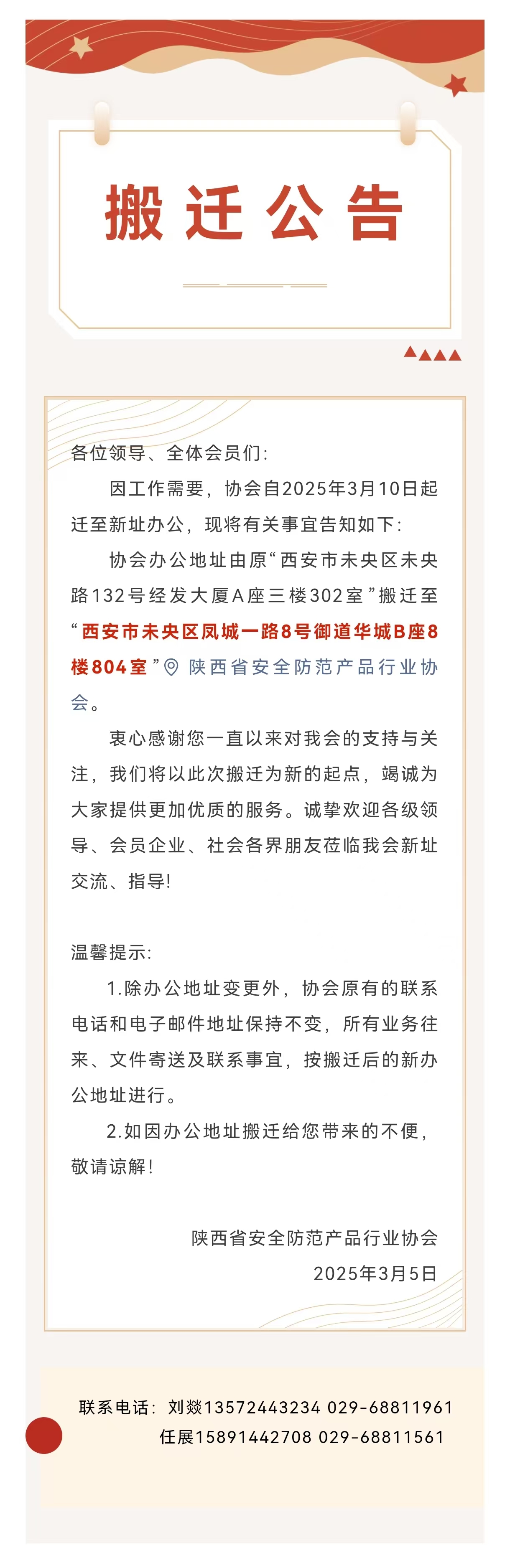 关于陕西省安全防范产品行业协会办公场所搬迁的公告